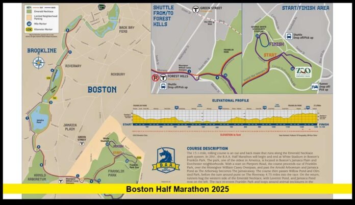 The Boston Half Marathon 2025 course begins and ends at Franklin Park, covering a scenic out-and-back loop through Boston’s Emerald Necklace park system.